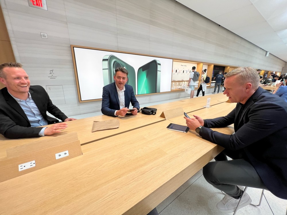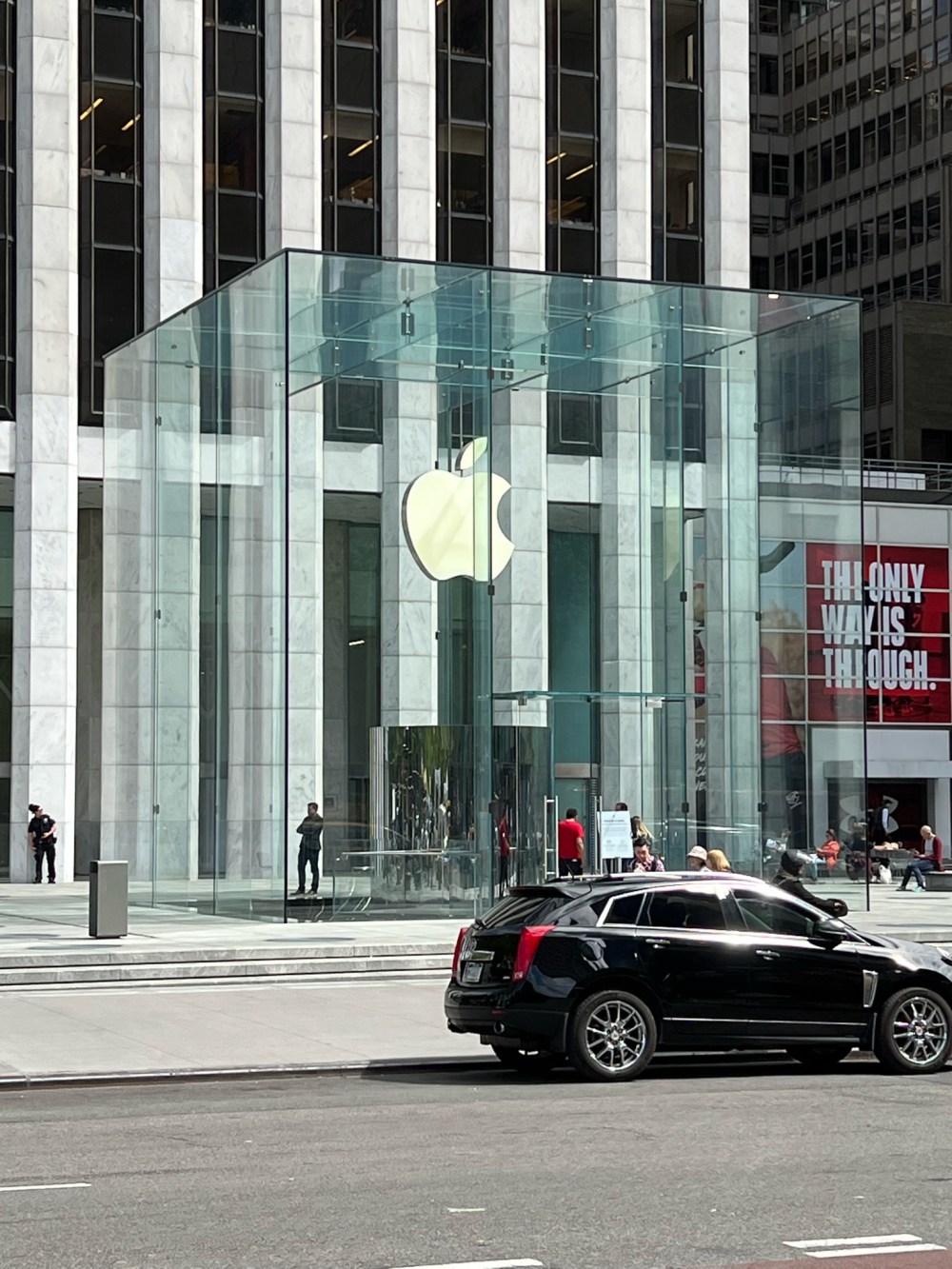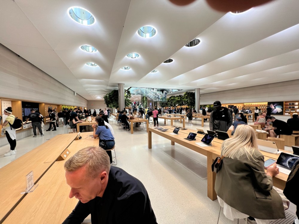 Apple store New York er ligesom at komme på et større bibliotek i Danmark. Der sidder mennesker alle steder og leger med det store udvalg af produkter, og man kan tilmelde sig gratis kurser for at lære at bruge de forskellige produkter.