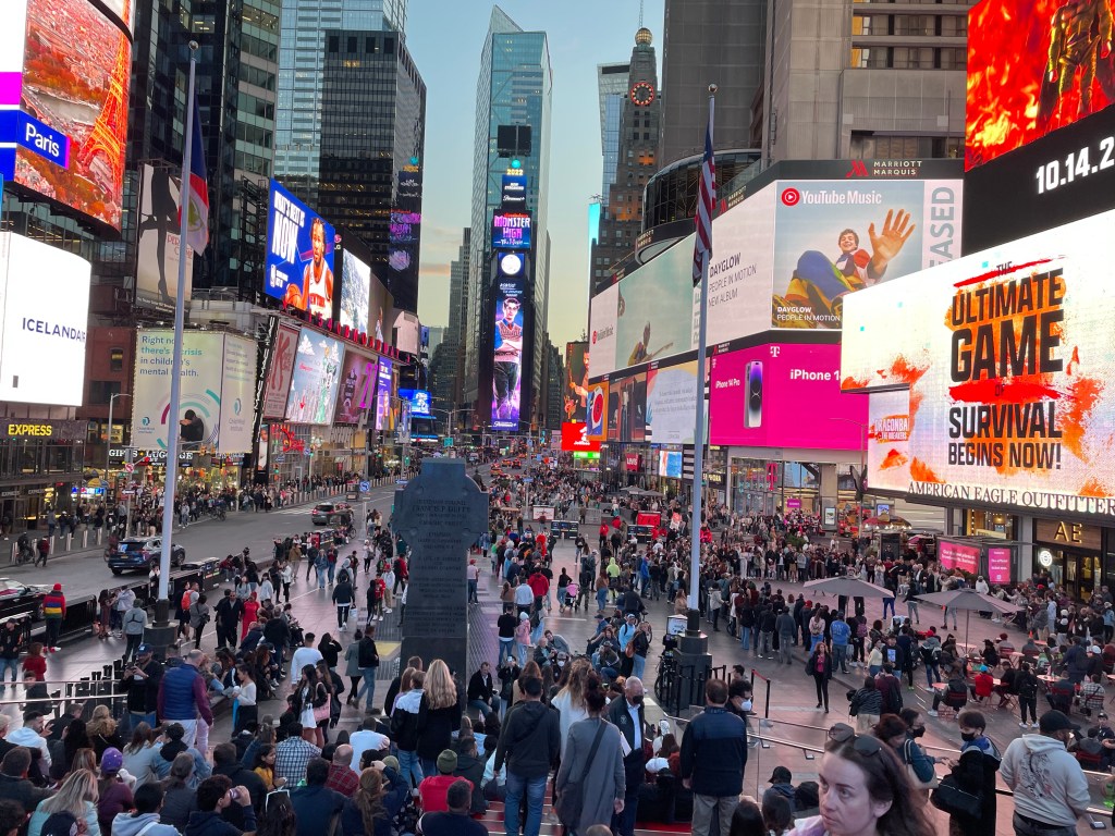 Få timer efter flyet ramte landingsbanen i New York, ramte vores fødder Times Square. Times Square er måske dét flest mennesker forbinder med New York City. Pladsen er samlingspunkt for et mylder af mennesker døgnet rundt – med store Billboards med reklamer og en masse High Street butikker med populære brands – alt fra tøj til slik.